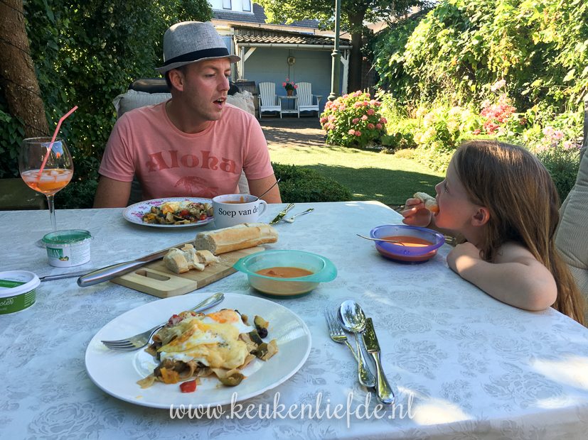 Het avondeten is een makkie: ik heb nog een kliekje tomatensoep en pasta in de koelkast staan en met een gebakken ei en stokbrood erbij, zijn we weer klaar.