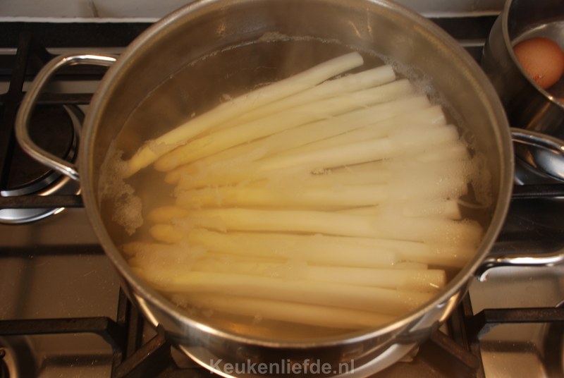 Breng het water aan de kook en zet het vuur lager. Kook de asperges 10 minuten koken tot ze beetgaar zijn. Zet het vuur uit en laat ze nog even verder nagaren in het kookwater.