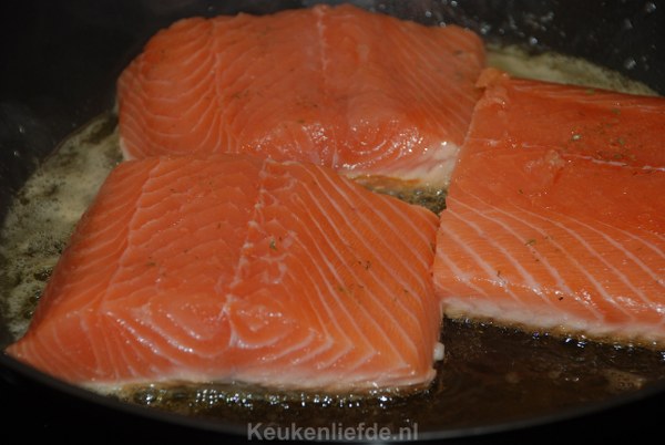 Zalm moet altijd nog glanzend van binnen zijn en net niet helemaal gaar. Wanneer je zalm te lang bakt wordt hij droog en beslist niet lekker, echt zonde! Blijf er dus altijd bij tijdens het bakken. Schep alles op borden en garneer met een beetje vers gehakte peterselie.