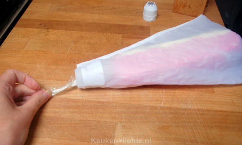 Als de botercrème te zacht is geworden om rozetjes mee te spuiten, leg hem dan in de koelkast en laat circa dertig tot vijfenveertig minuten opstijven.