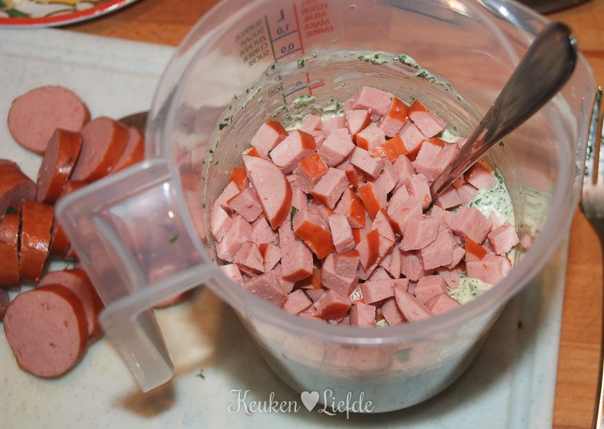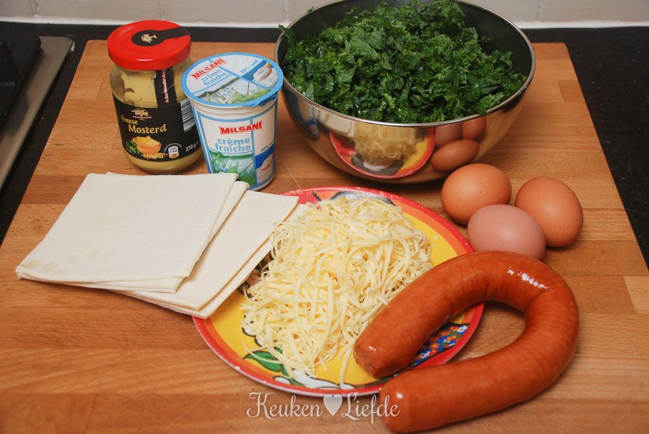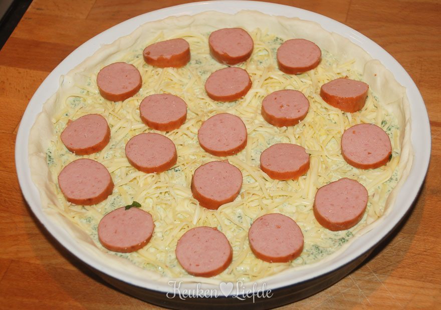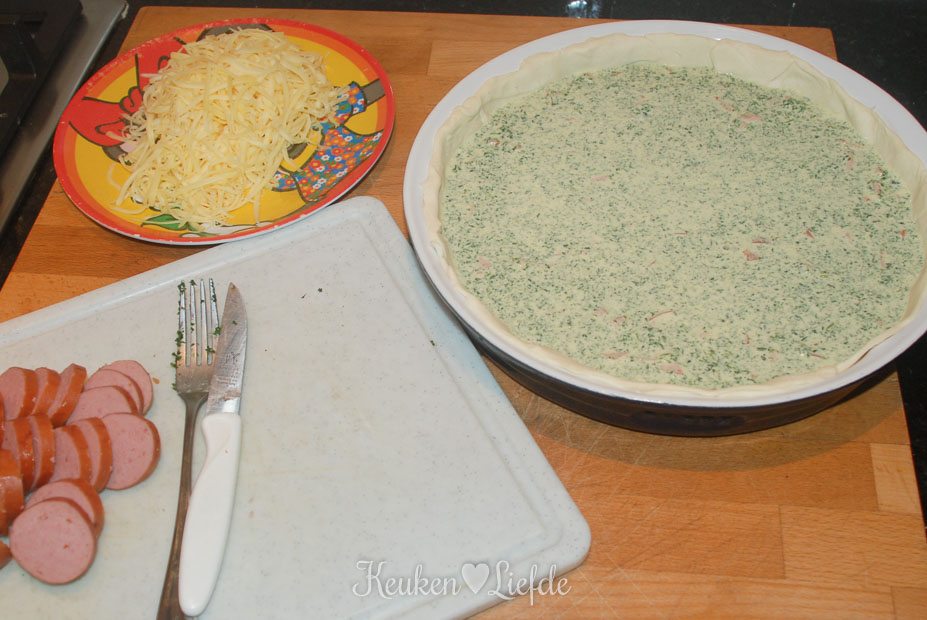 Snijd de helft van de rookworst in plakken en de andere helft in kleine blokjes. Roer de blokjes rookworst en fijngehakte boerenkool door het eimengsel en schenk dit mengsel over het bladerdeeg.