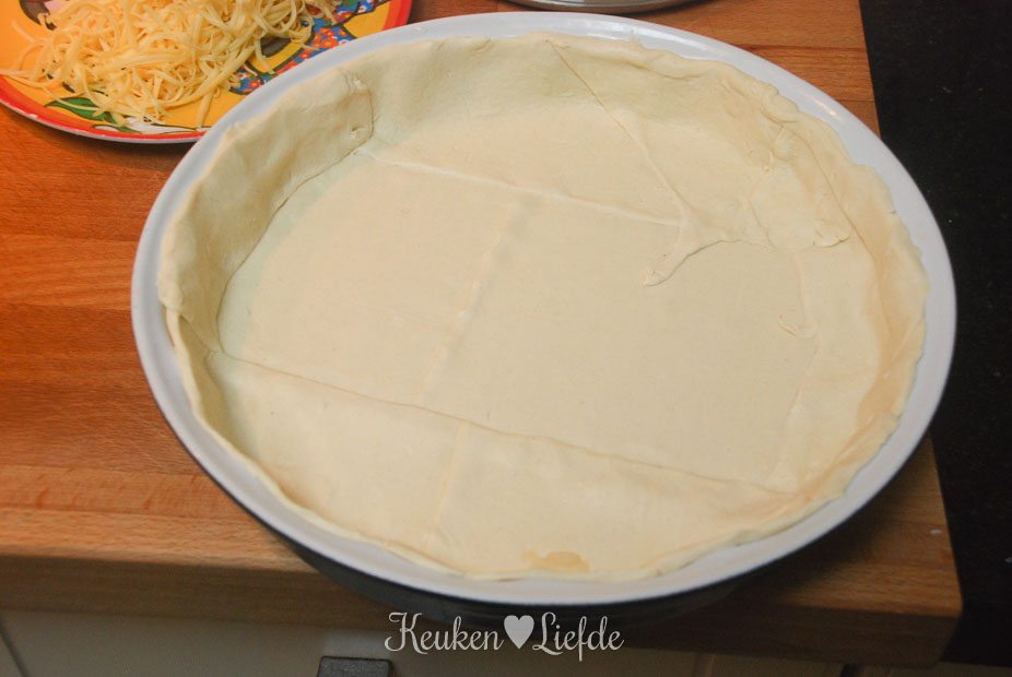 Verwarm de oven voor op 180 graden. Vet de quichevorm in met olie of boter. Laat de plakjes bladerdeeg ontdooien en beleg hiermee de quichevorm.