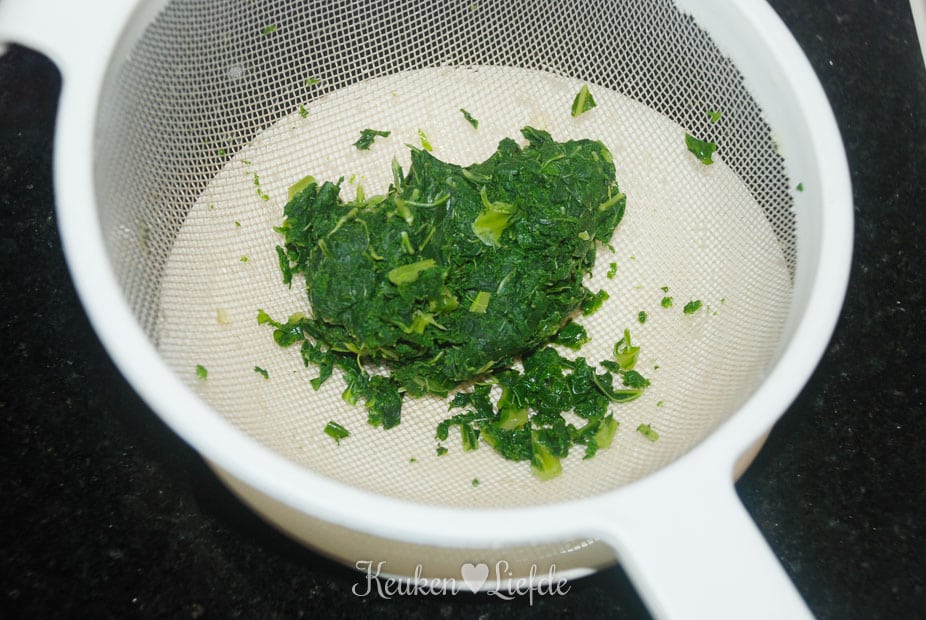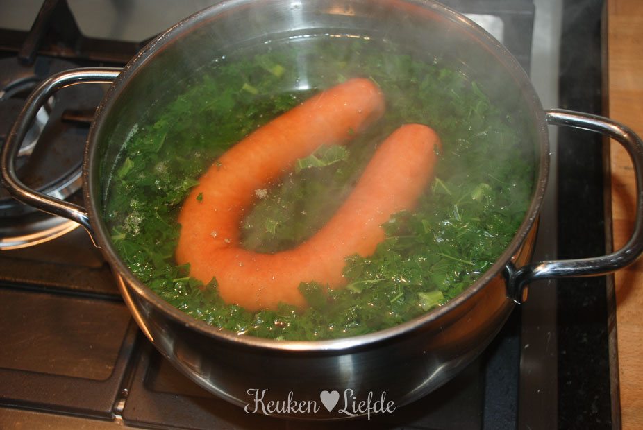 Als de boerenkool gaar is, haal je de rookworst uit de pan en leg opzij. Giet de boerenkool af en laat goed uitlekken in een zeef. Druk met je hand al het overtollige vocht eruit, tot er een zielig, klein hoopje overblijft. 🙂