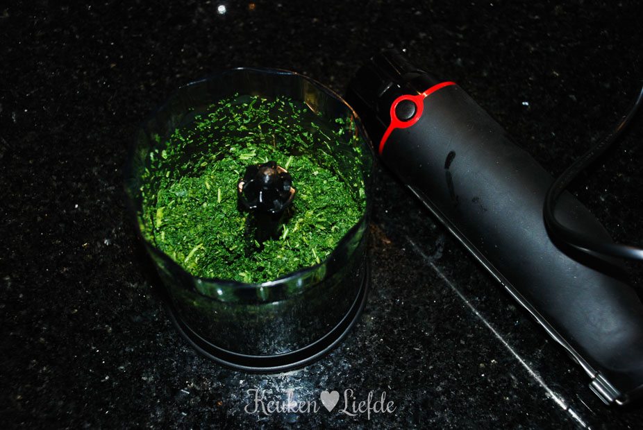Dep de boerenkool droog op een theedoek en hak heel fijn in de keukenmachine.