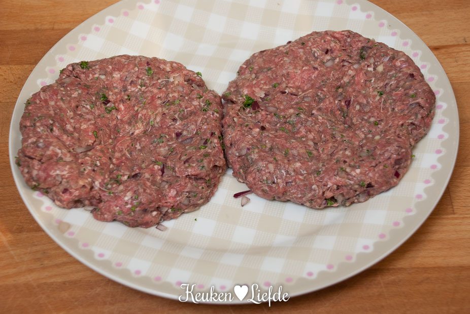 Meng de ingrediënten voor de hamburgers door elkaar, breng op smaak met peper en zout en vorm er twee grote burgers van. Leg op een bord afgedekt met vershoudfolie en zet minimaal 30 minuten in de koelkast.