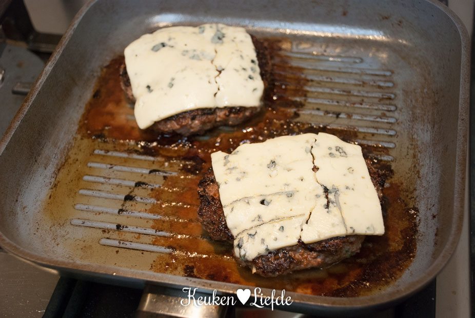 Leg de hamburgers op de gril en bak ze, totdat de bovenkant van de hamburgers vochtig wordt en ze loslaten van de gril. Keer ze om en bedek met een plakje blauwekaas. Laat even smelten en haal de burgers van de gril.