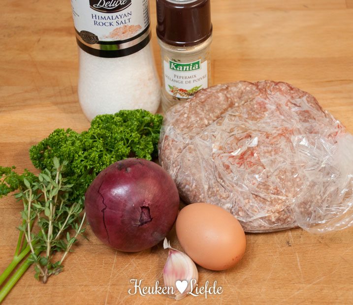 Meng de ingrediënten voor de hamburgers door elkaar, breng op smaak met peper en zout en vorm er twee grote burgers van. Leg op een bord afgedekt met vershoudfolie en zet minimaal 30 minuten in de koelkast.