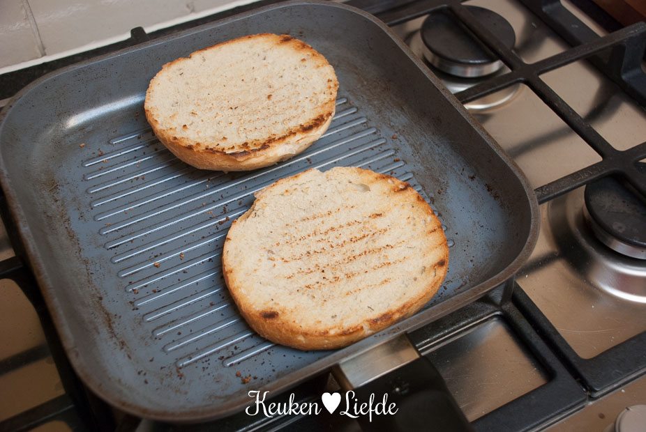Steek de barbecue aan, of verwarm de grillpan. Snijd de Italiaanse bollen open en gril ze op de opengesneden kant, totdat ze licht kleuren. Leg op een bord en zet opzij. Gril de plakjes pancetta, totdat ze licht goudbruin en krokant zijn. (Als je ze op de barbecue grilt, leg ze dan op een aluminium grillbakje.) Leg op een bord en zet opzij.