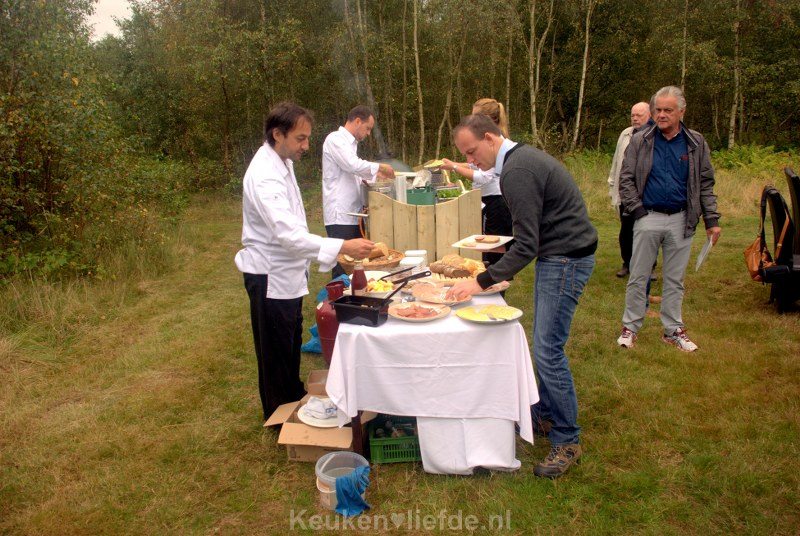 Al knipperend met m’n ogen zie ik hoe er op een joekel van een Big Green Egg flinke stukken, weergaloos lekker spek voor ons worden bereid (ze waren zo botermals, zo sappig en zo verrukkelijk dat terwijl ik dit schrijf het water me opnieuw in de mond stroomt), hoe dampend roerei met Hollandse garnalen ons verleidelijk aanstaren, net als gewillige kreukels (kleine zeeslakken), malse vleeswaren, jonge en oude kazen, en een eindeloos assortiment versgebakken broodjes. Ja, zo wil ik elke ochtend ontbijten! (Johan weet het nog niet, maar we gaan op zoek naar ons eigen verwenhuis diep in het bos.)