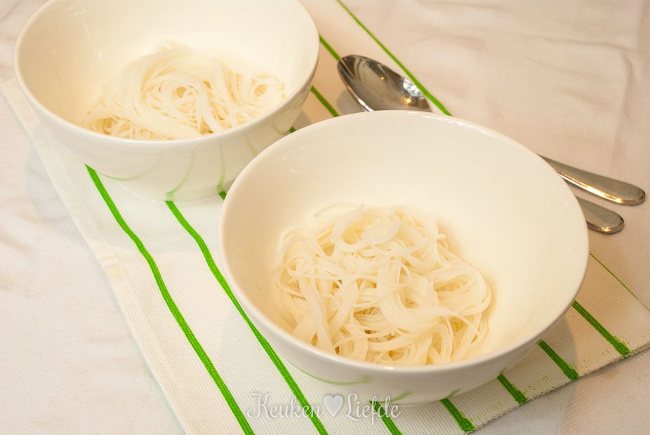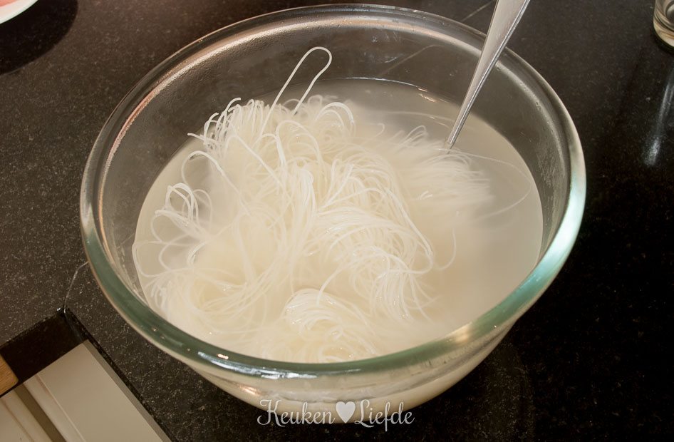 Leg de rijstnoedels in een ruime kom en schenk er zoveel kokend water over, totdat ze onder staan. Zet zolang opzij.