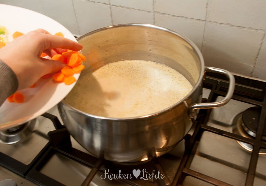 Verhit een ruime kook- of soeppan met wat olie en fruit op laag vuur, al roerend, de currypasta aan. Voeg na een minuut de kokosmelk, 750 ml water en de verkruimelde kippenbouillontabletten toe, zet het vuur hoog en breng aan de kook. Zodra de soep kookt, zet je het vuur weer lager (de soep moet net tegen de kook aan blijven) en voeg je de wortels toe.