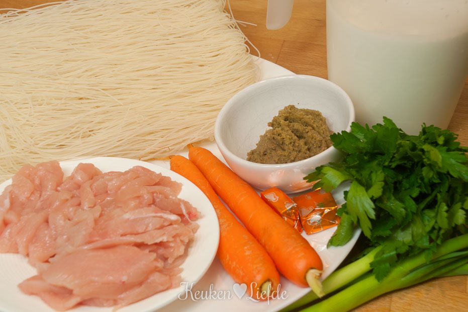 In plaats van kip kun je ook rauwe, gepelde garnalen toevoegen en op het laatste moment nog een handje taugé meewarmen.