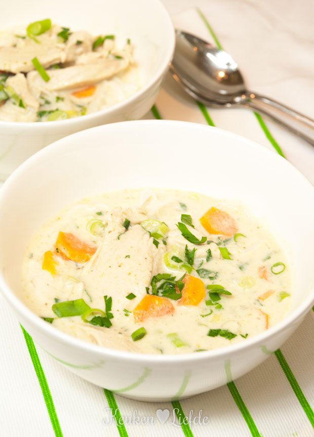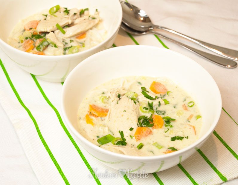 Kook de wortels beetgaar en voeg dan de lente-ui, peterselie en kip toe. Kook zachtjes enkele minuten verder, totdat de kipfilet gaar is. Dit duurt circa 2 minuten.