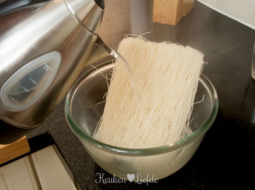 Leg de rijstnoedels in een ruime kom en schenk er zoveel kokend water over, totdat ze onder staan. Zet zolang opzij.