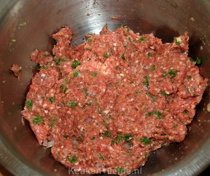 Pel het teentje knoflook. Doe het gehakt in een kom en pers het knoflookteentje erboven uit. Pel het sjalotje en snipper hem fijn. Was de peterselie, dep goed droog en hak fijn. Doe alle ingrediënten, behalve de parmaham, bij het gehakt en kneed met je handen goed door elkaar.