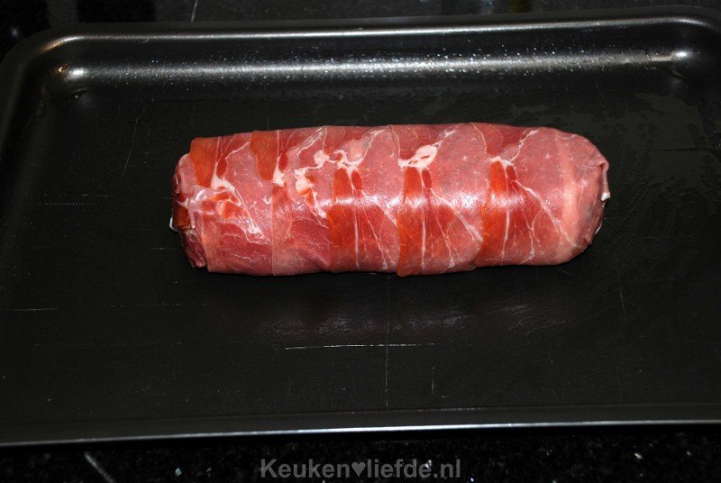 Verwarm de oven voor op 180 graden. Leg de plakjes parmaham, elkaar iets overlappend, op een snijplank. Vorm met je handen een ovaalvormig gehaktbrood en leg dit op de parmaham. Rol het gehakt voorzichtig in de parmaham en leg het gehaktbrood met de ‘naad’ naar beneden op een ingevet bakblik.