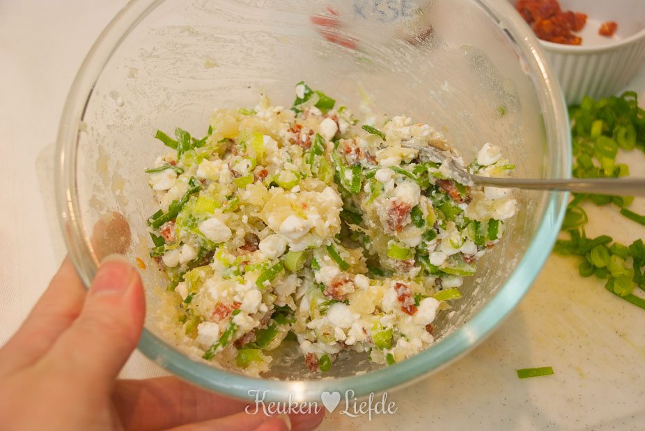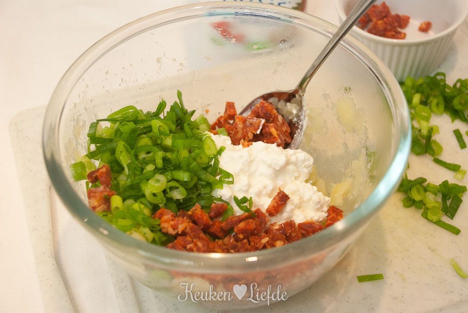 Verwijder het folie en snijd de zoete aardappels over de lengte doormidden. Hol ze voorzichtig uit met een lepel en schep de uitgeholde zoete aardappel in een kom. Roer los met een vork en vermeng met de Hüttenkäse, chorizo en lente-ui. Breng eventueel verder op smaak met wat zout en peper. Leg de gehalveerde zoete aardappels in een – licht ingevette – ovenschaal en schep de vulling erin.