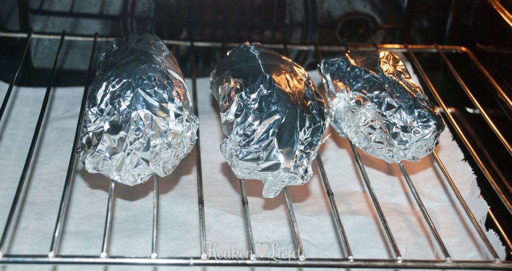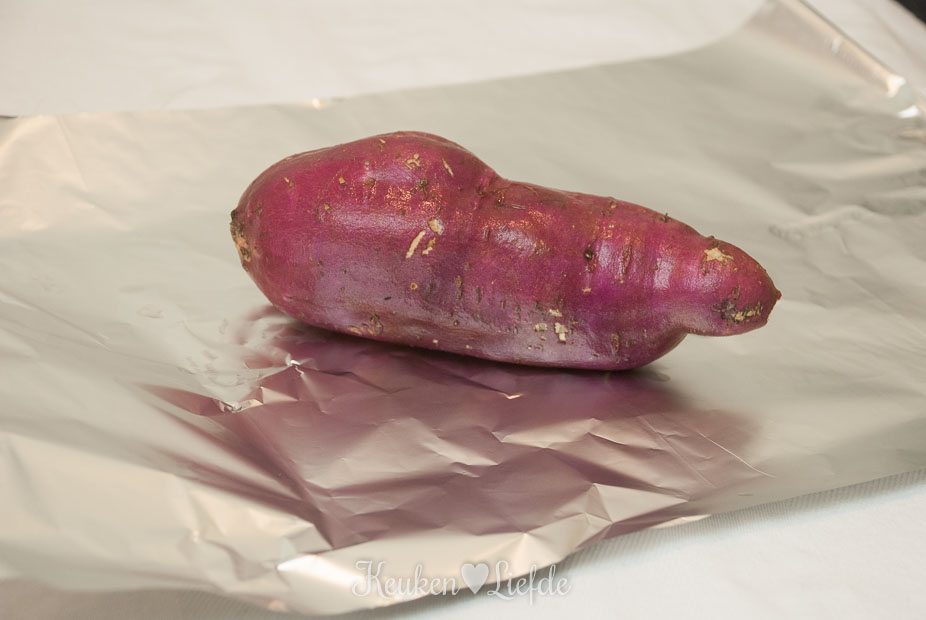 Verwarm de oven voor op 200 graden. Was de zoete aardappels onder de koude kraan en dep ze droog. Wikkel de aardappels apart van elkaar in een stuk folie en leg ze op een rooster in het midden van de oven. Pof de aardappels in circa 50 tot 60 minuten gaar. Haal de zoete aardappels uit de oven, maar laat de oven aan staan.