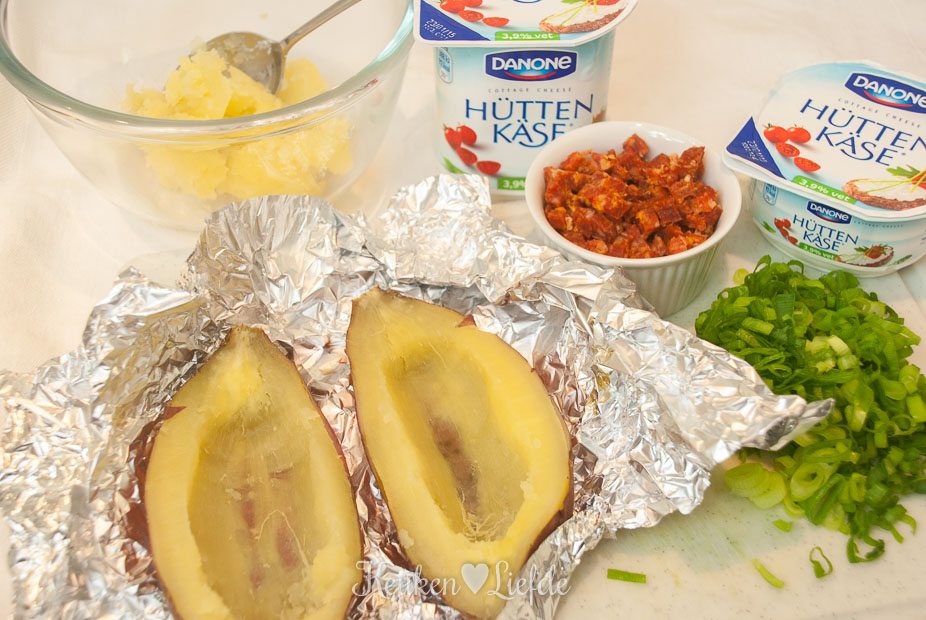 Verwijder het folie en snijd de zoete aardappels over de lengte doormidden. Hol ze voorzichtig uit met een lepel en schep de uitgeholde zoete aardappel in een kom. Roer los met een vork en vermeng met de Hüttenkäse, chorizo en lente-ui. Breng eventueel verder op smaak met wat zout en peper. Leg de gehalveerde zoete aardappels in een – licht ingevette – ovenschaal en schep de vulling erin.