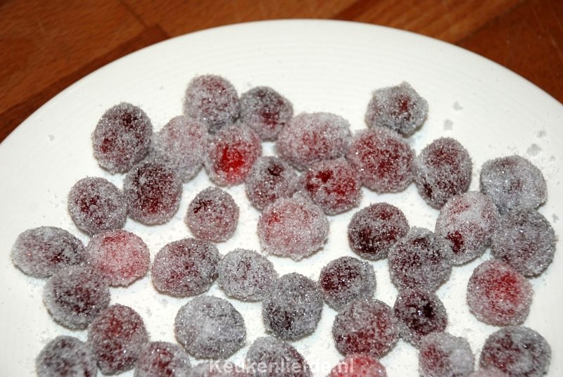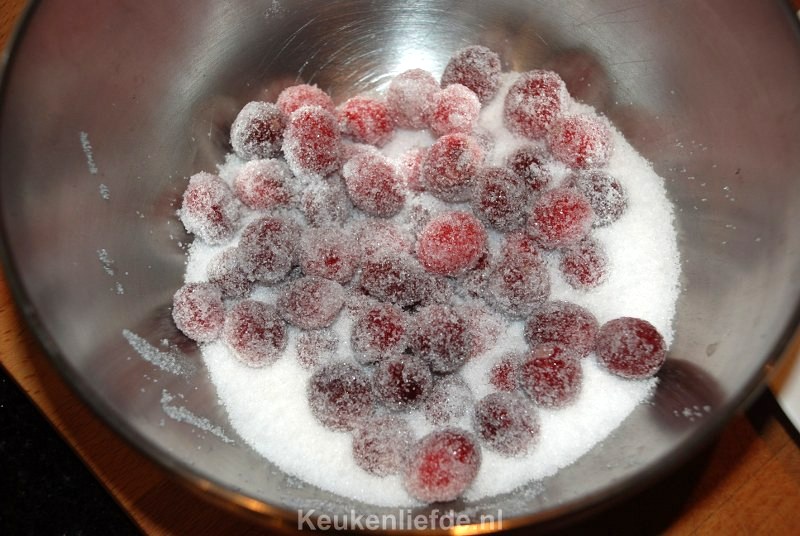 Laat helemaal afkoelen en zet vervolgens afgedekt 8 – 24 uur in de koelkast. Doe de fijne suiker in een lage schaal of diep bord. Giet de cranberry’s af in een vergiet, vang eventueel de suikersiroop op. Rol de cranberry’s in gedeelten door de suiker.