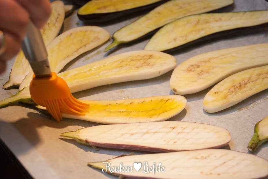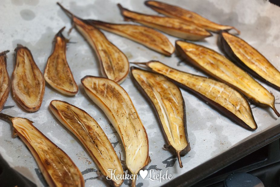 Leg de aubergines op een met bakpapier bekleed bakblik en bestrijk het vruchtvlees royaal met olijfolie, herhaal dit totdat de aubergine geen olie meer opzuigt. Bestrooi ze met versgemalen zout en peper en bak ze circa 35 minuten in de oven, of totdat ze goudbruin zijn en het vruchtvlees zacht is. Haal ze uit de oven, maar laat de oven aanstaan.