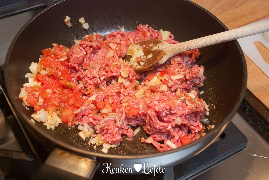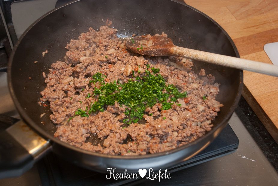 Bak ondertussen – als de aubergines in de oven zitten – in een koekenpan de ui en knoflook in wat olie, totdat ze zacht maar niet gekleurd zijn. Halveer één tomaat en snijd de bovenste helft in dunne plakjes (dit dient straks voor garnering). Zet opzij. Snijd met een mesje de steelaanzet uit de onderkant van de tomaten en knijp het vocht eruit. Hak de tomaten fijn. Voeg de tomaten, het gehakt en rode peper toe aan de ui en bak het gehakt op hoog vuur rul. Breng op smaak met de gyroskruiden. Bak net zolang totdat het vrijgekomen bakvet en vocht verdampt is en zet dan het vuur uit. Roer 2/3 van de peterselie door het gehakt.