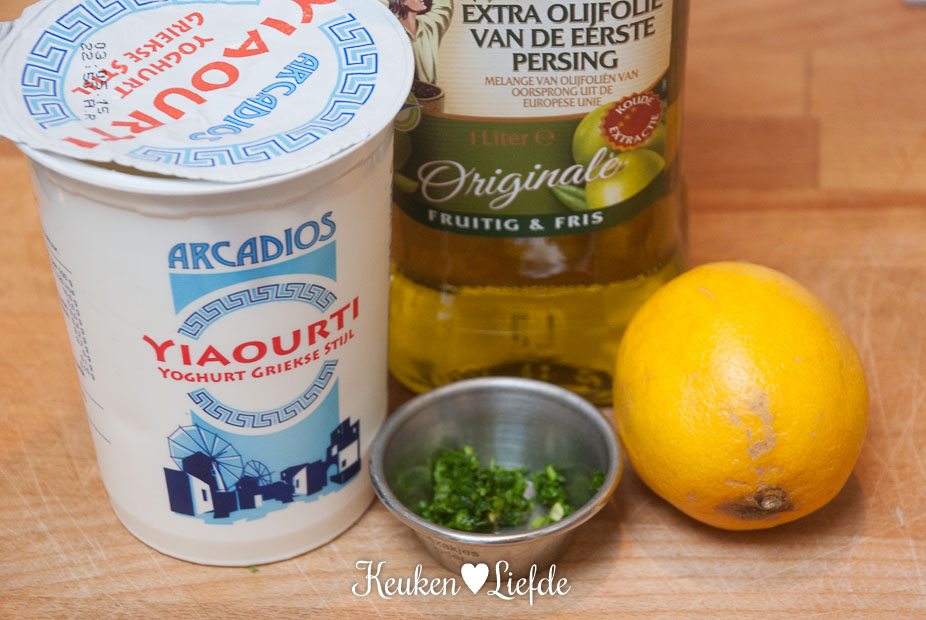 Roer de yoghurt los met wat citroensap en roer de overige peterselie erdoor. Drizzle eventueel nog wat extra olijfolie over de aubergines en serveer met de yoghurtsaus.