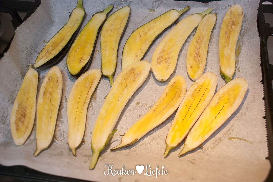Leg de aubergines op een met bakpapier bekleed bakblik en bestrijk het vruchtvlees royaal met olijfolie, herhaal dit totdat de aubergine geen olie meer opzuigt. Bestrooi ze met versgemalen zout en peper en bak ze circa 35 minuten in de oven, of totdat ze goudbruin zijn en het vruchtvlees zacht is. Haal ze uit de oven, maar laat de oven aanstaan.
