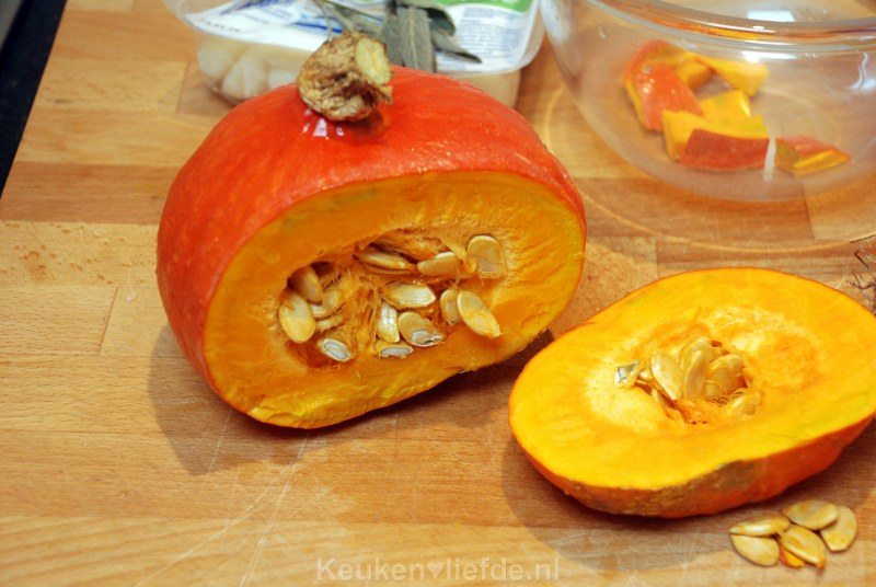 Was de pompoen en dep droog. Pak het scherpste mes uit je keukenlade en verwijder de harde aanzet aan de bovenkant van de pompoen en eventuele verhardingen op de schil. Snijd de pompoen doormidden en schep met een lepel de pompoenpitten uit de binnenkant van de pompoen. Snijd de pompoen in blokjes (schillen is niet nodig), ongeveer even groot als de gnocchi.