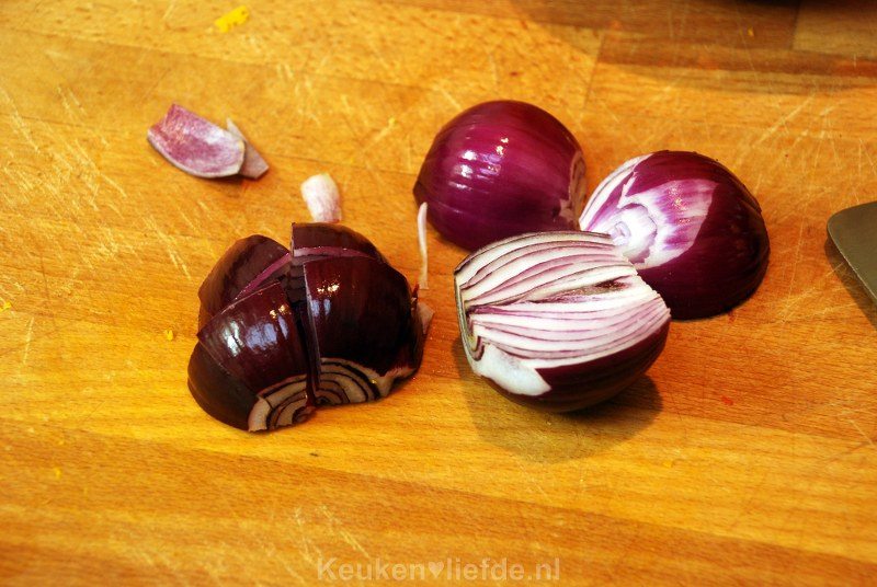 Pel de ui, snijd doormidden en snijd elke helft in vieren.