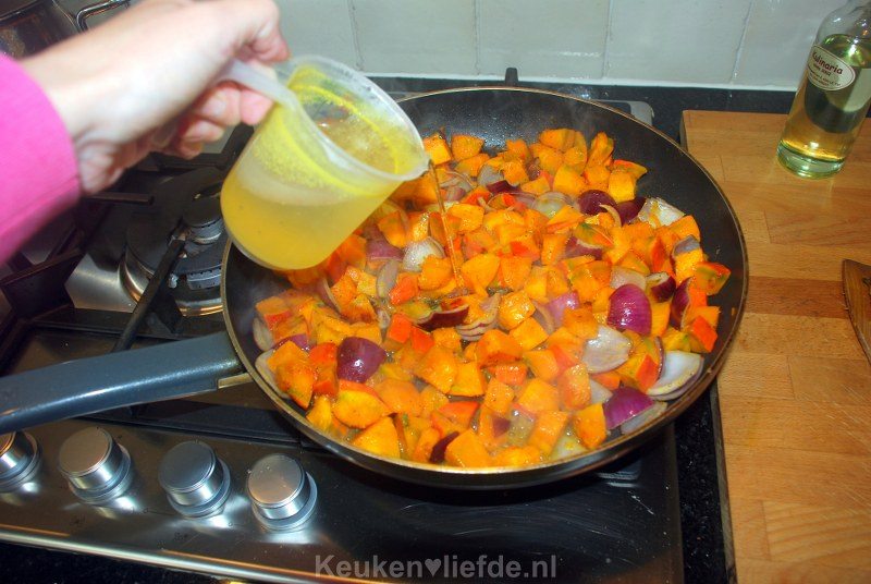 Verhit ondertussen een grote hapjes-, of koekenpan met wat olie en bak de pompoen en rode ui op hoog vuur, totdat ze licht beginnen te kleuren. Voeg de bouillon en salie (houd wat salie achter voor garnering) toe en zet het vuur wat lager.