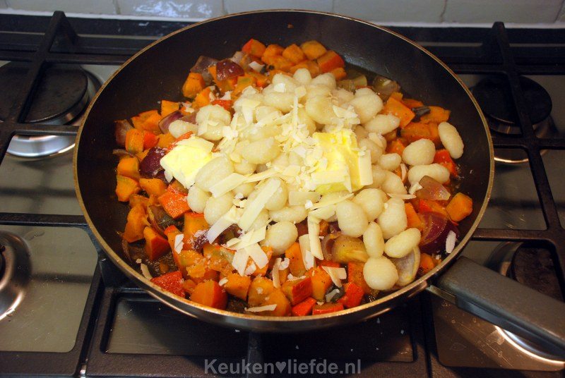 Laat zachtjes verder pruttelen totdat de bouillon bijna verdampt is en de pompoen gaar is. Voeg als de pompoen bijna gaar is, de gnocchi toe aan het kokende water en kook ze volgens de beschrijving op het pak gaar. Giet de gnocchi af en voeg samen met de boter toe aan de pompoen.