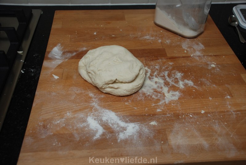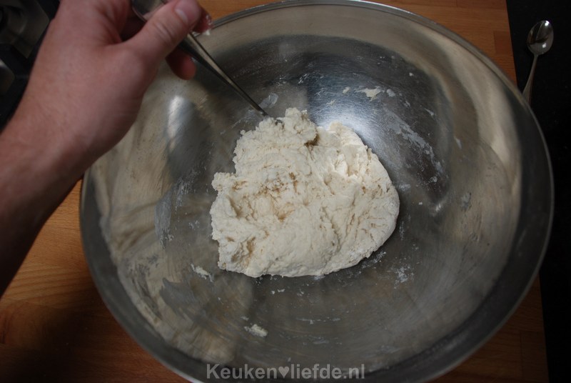 Roer met een lepel totdat je een bal krijgt en kneed dan verder met je handen tot het loskomt van de kom.