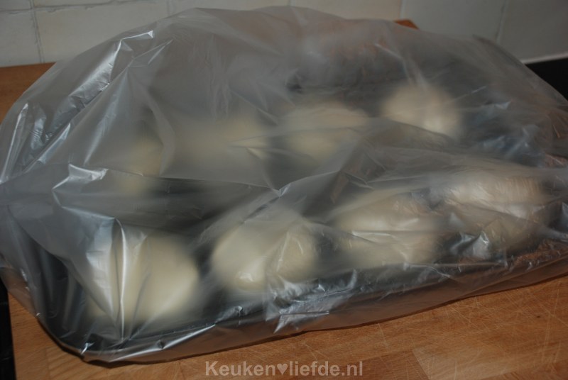 Dek het bakblik af met een grote plastic zak en laat de bolletjes voor de tweede keer rijzen op een warme plek, ongeveer een half uur.