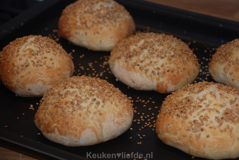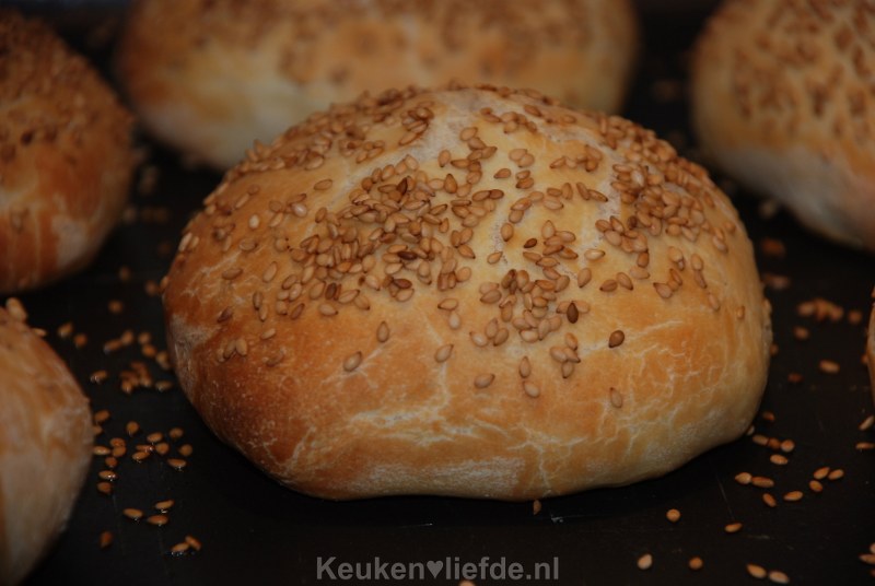 Wij maakten deze broodjes voor ons eigengemaakte broodje hamburger, maar je kunt de broodjes natuurlijk ook als ontbijt eten. Warm uit de oven en iets afgekoeld smaken ze het lekkerst. In plaats van sesamzaadjes kun je de broodjes ook bestrooien met zonnebloempitten of andere pitten en/of zaden.
