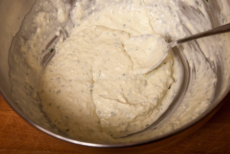 Doe de mayonaise, yoghurt, prei, peterselie en knoflook in de keukenmachine en mix tot een gladde saus. Doe de saus in een kom en klop de roomkaas erdoor.