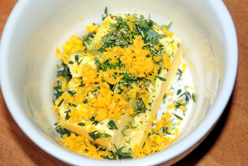 Was de kruiden, dep ze droog en hak ze fijn (niet de steeltjes). Houd een paar takjes kruiden achter. Rasp de gele schil van de citroen en pers het sap uit. Duw de uitgeperste citroen samen met wat takjes kruiden in de holte van de kip. Roer de gehakte kruiden en het citroenrasp door de boter en breng op smaak met peper en zout.