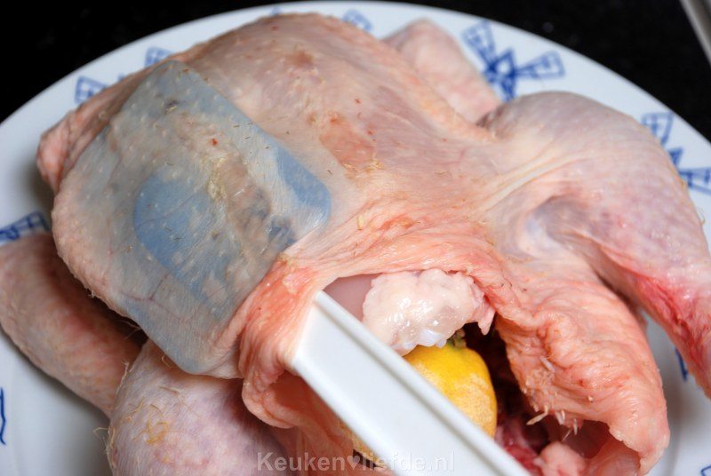 Spoel de kip van binnen en buiten goed af onder de kraan en dep droog met keukenpapier. Duw aan de halsopening van de kip voorzichtig met je handen of een spatel onder het vel, zodat er ruimte ontstaat.