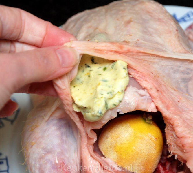 Pas wel op dat het vel niet scheurt. Duw hier een gedeelte van de kruidenboter tussen en verdeel de boter met je handen onder het vel van de kip.