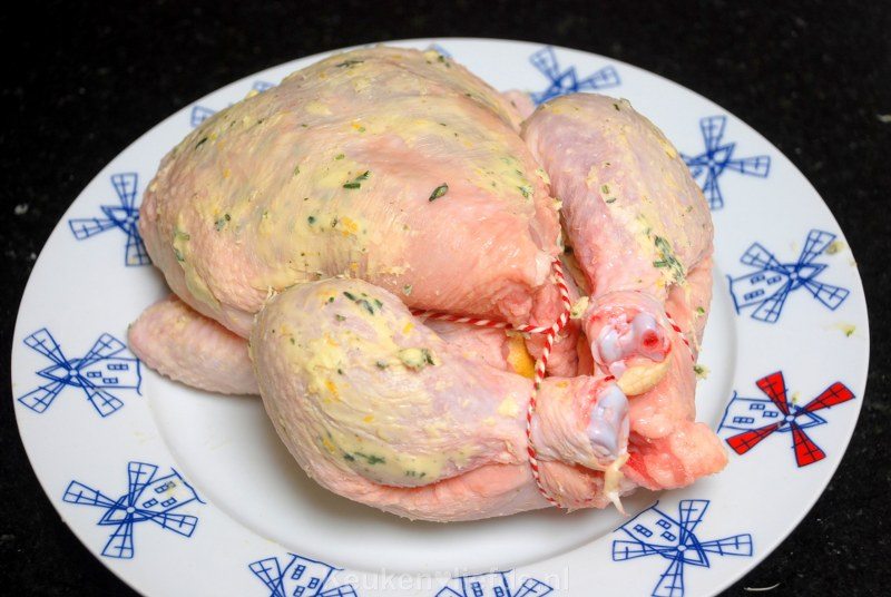 Verdeel de rest van de boter over de buitenkant van de kip. Bind de kip op met keukentouw.