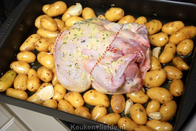 Zie hier een filmpje hoe je dit heel makkelijk doet. Leg de kip met de borst naar beneden op het bakblik en verdeel de krieltjes en teentjes knoflook eromheen (de knoflooktenen druk je straks op je bord, zo uit het vel en hebben een verrukkelijke zoete smaak).