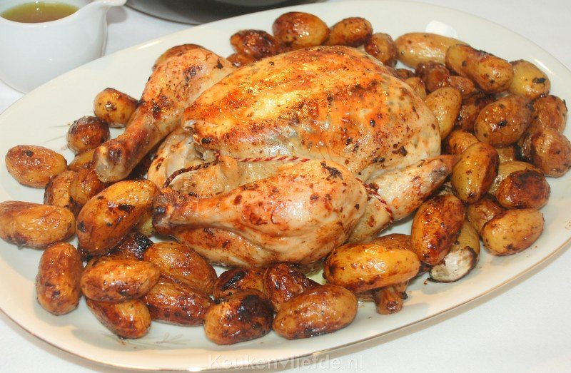 Dit is een van mijn favoriete gerechten die ik maak als ik echt iets heel lekkers wil eten, maar niet te lang in de keuken wil staan. Een hele gebraden kip uit de oven met kleine krielaardappeltjes in de schil. Alles gaat bij elkaar op het bakblik in de oven en heeft dezelfde bereidingstijd. Lekker makkelijk dus! Serveer er Engelse doperwten met spek en sla bij en geniet van een waar feestmaal!