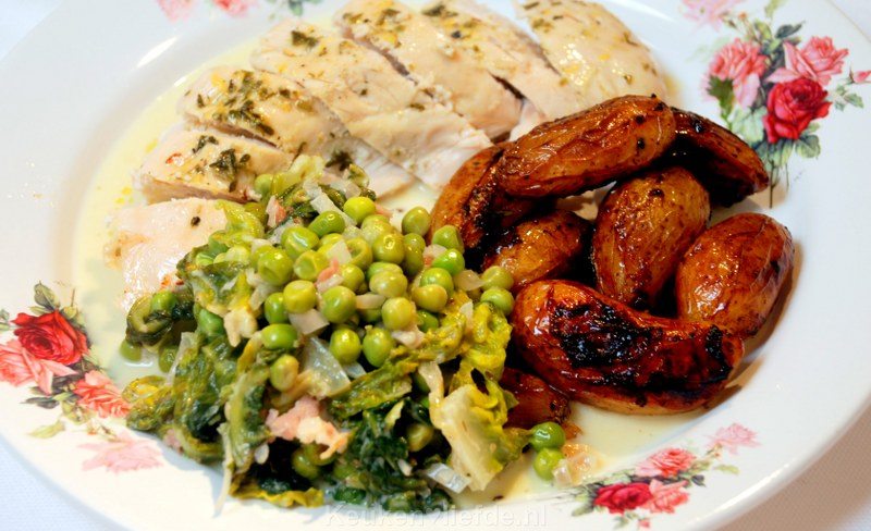 Laat de kip minimaal 10 tot 15 minuten staan voordat je hem aansnijdt, dek eventueel af met aluminiumfolie om warm te houden. Je hebt nu genoeg tijd om een bijgerecht te maken zoals bijvoorbeeld de Engelse doperwten met sla en spek.