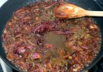 Laat iets inkoken en voeg dan de bouillon toe. Voor een extra volle en zachte smaak kun je nu eventueel nog wat blokjes roomboter toevoegen aan de jus, ongeveer 40 gram. Ik heb dit achterwege gelaten. Laat weer inkoken tot de gewenste dikte.
