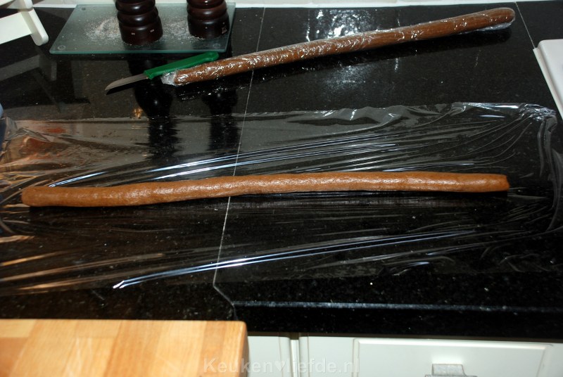 Verdeel in twee stukken en rol ieder stuk deeg uit tot ongeveer 50 cm lang.