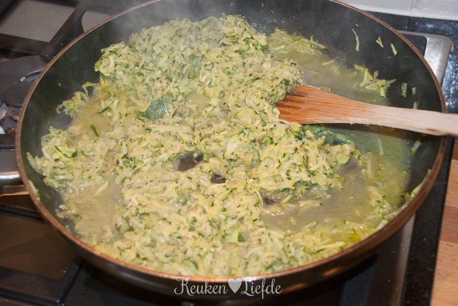 Verhit een koekenpan met wat olijfolie en voeg de courgettes, pesto en Parmezaan toe. Breng eventueel op smaak met zout en peper. Bak de courgettes op hoog vuur. De courgettes laten veel vocht los, waardoor ze gaar smoren in hun eigen vocht. Laat het vocht grotendeels op hoog vuur verdampen, totdat de courgettes gaar zijn.