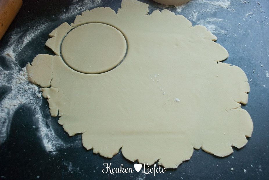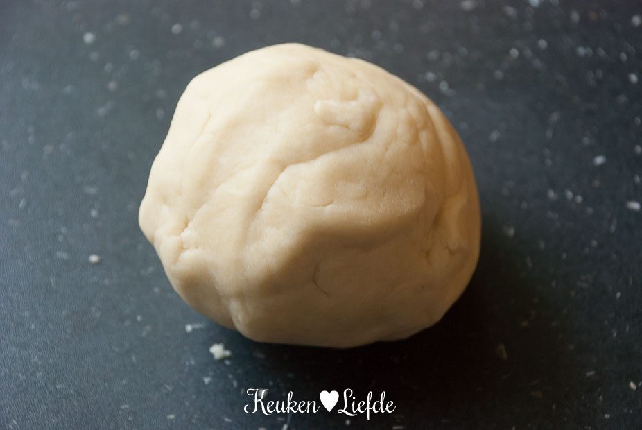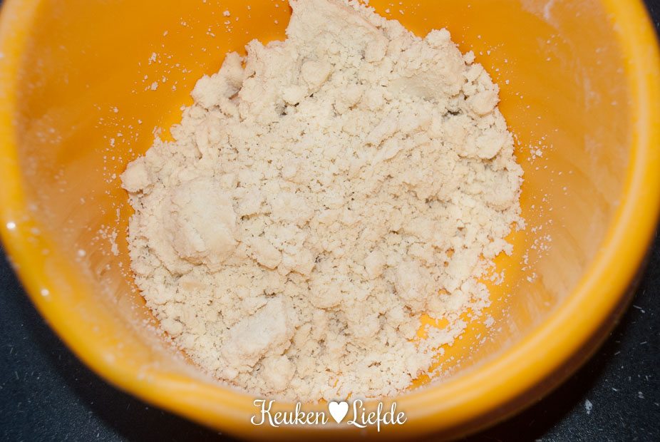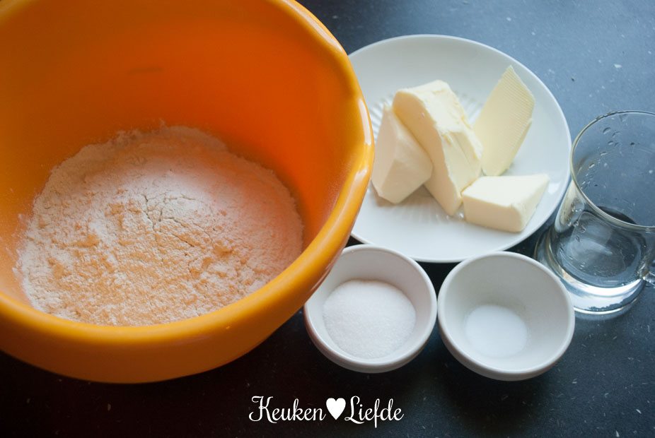 Meng de bloem, custardpoeder, boter, zout en suiker in een kom en kneed met je handen (of met een keukenmachine met deeghaak) zo snel mogelijk tot een gladde deegbal. Voeg indien nodig 1 of 2 eetlepels koud water toe als het deeg na een tijdje kneden nog te kruimelig is. Wikkel de deegbal in vershoudfolie en laat minimaal een uur tot maximaal een nacht rusten in de koelkast (hierdoor kun je het deeg straks beter uitrollen).