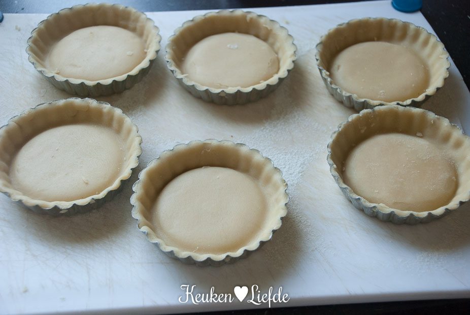 Verwarm de oven voor op 200 graden. Vet de taartvormpjes in met boter en bestuif ze met bloem (tik het overtollige bloem eruit). Knip uit bakpapier 6 rondjes van circa 12 cm diameter. Rol het deeg uit tot een grote lap op een licht bebloemd werkvlak. Snijd of steek 6 rondjes uit het deeg van 12 cm diameter en bekleed de tartelette vormpjes hiermee. Prik met een vork gaatjes in de bodem en vul de vormpjes met bakpapier en de steunvulling.