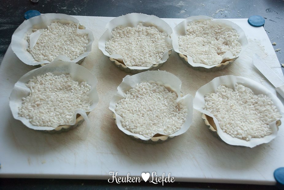 6 kleine tartelette vormpjes, bakpapier, blinde bak/steunvulling