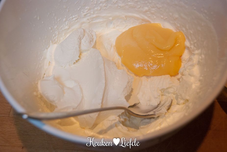 Klop de slagroom tot stijve pieken en meng met de mascarpone en lemoncurd. Voeg net zoveel lemoncurd toe, totdat de room voor jou de juiste smaak heeft.